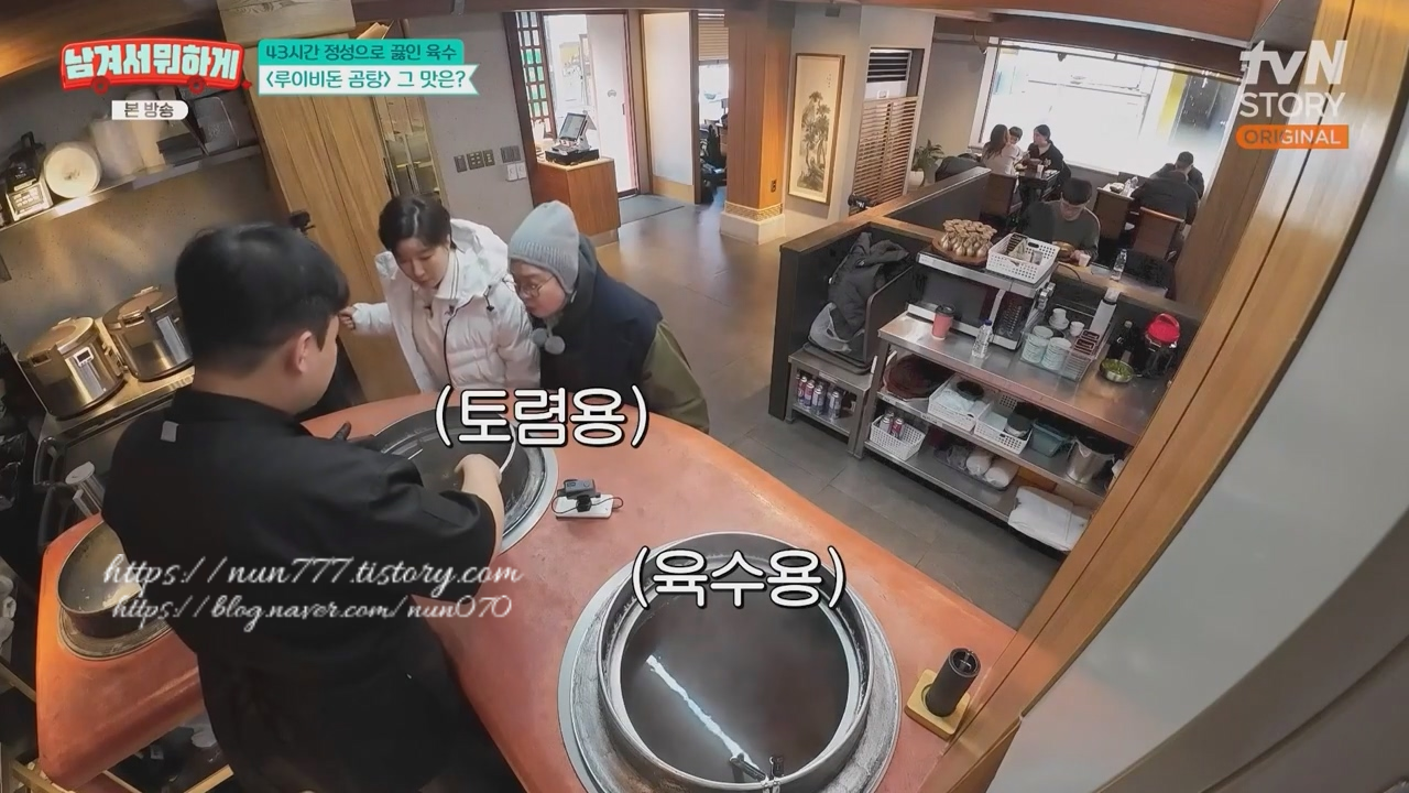 이 가마솥은 2개가 있는데 용도는 토렴용과 육수용으로 토렴은 밥이나 국수를 그릇에 담은 뒤 뜨거운 국물을 부었다가 따라내는 행동을 반복해 담은 음식을 데우고 불리는 과정을 말합니다.