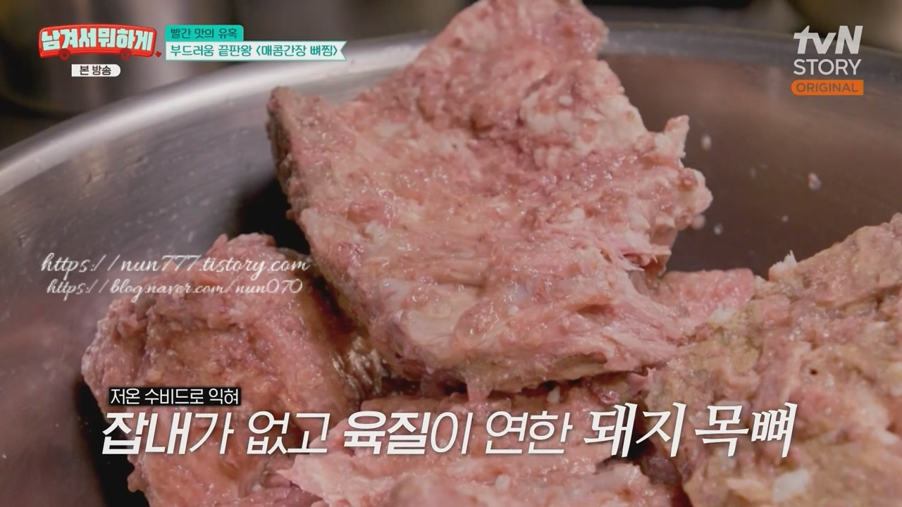 돼지 목뼈를 12시간 동안 흐르는 물에서 핏물을 빼고 특제 육수를 넣고 진공 포장을 한 후 80도에서 3시간 동안 수비드를 하면 잡내가 없고 육질이 연하게 됩니다.