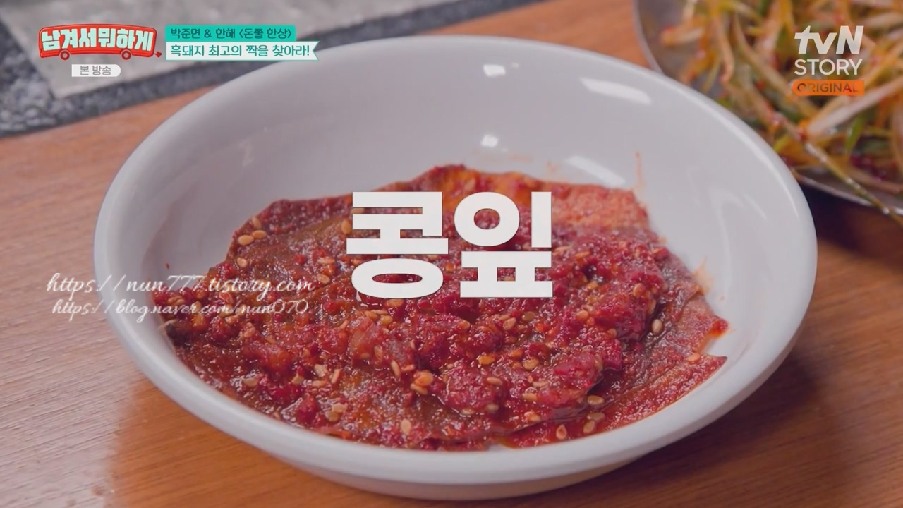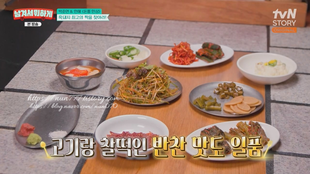 지리산 산청 뽕나무 잎이 들어간 소금, 저염 명란, 갓지짐, 파채, 무생채, 오이소박이, 감자샐러드, 콩잎이 나오는데 어느 하나 고기와 어울리지 않는 양념이나 반찬이 없습니다.